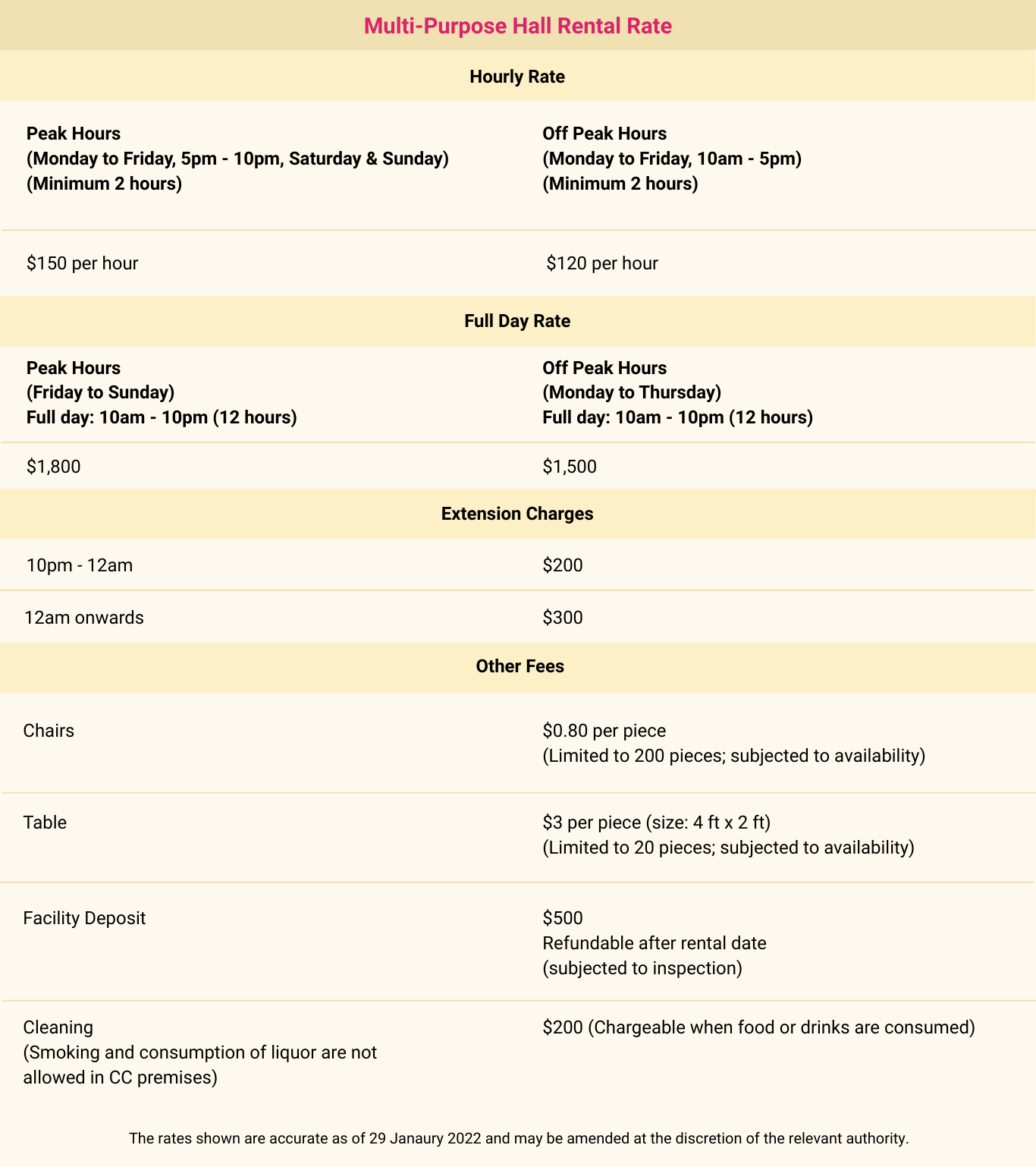 The Multi-Purpose Hall is a versatile space suitable for community events, workshops, meetings and recreational activities with a capacity of up to 200 pax.